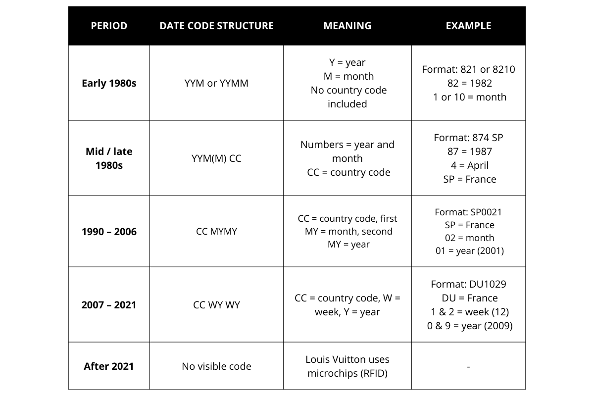Niet elke Louis Vuitton tas heeft een date code. Louis Vuitton begon met het toevoegen van date codes rond 1982, maar is sinds maart 2021 hiermee gestopt. Sindsdien gebruikt Louis Vuitton geen date codes meer, maar microchips (RFID) die in de tas zijn verwerkt. Deze chips zijn onzichtbaar en kunnen alleen door Louis Vuitton zelf worden uitgelezen. Ze bevatten informatie over het productieland, de productiedatum en interne verkoopgegevens.