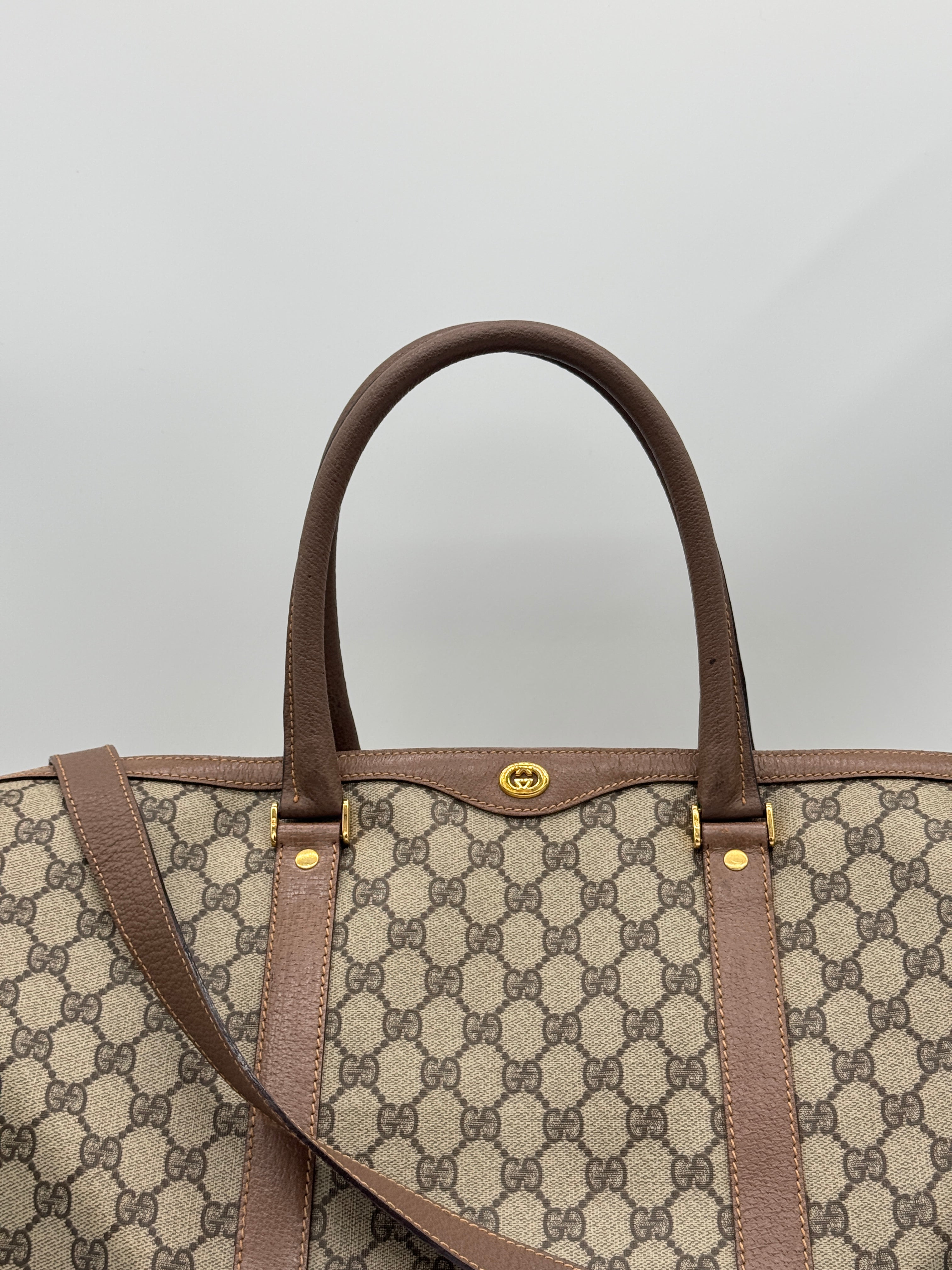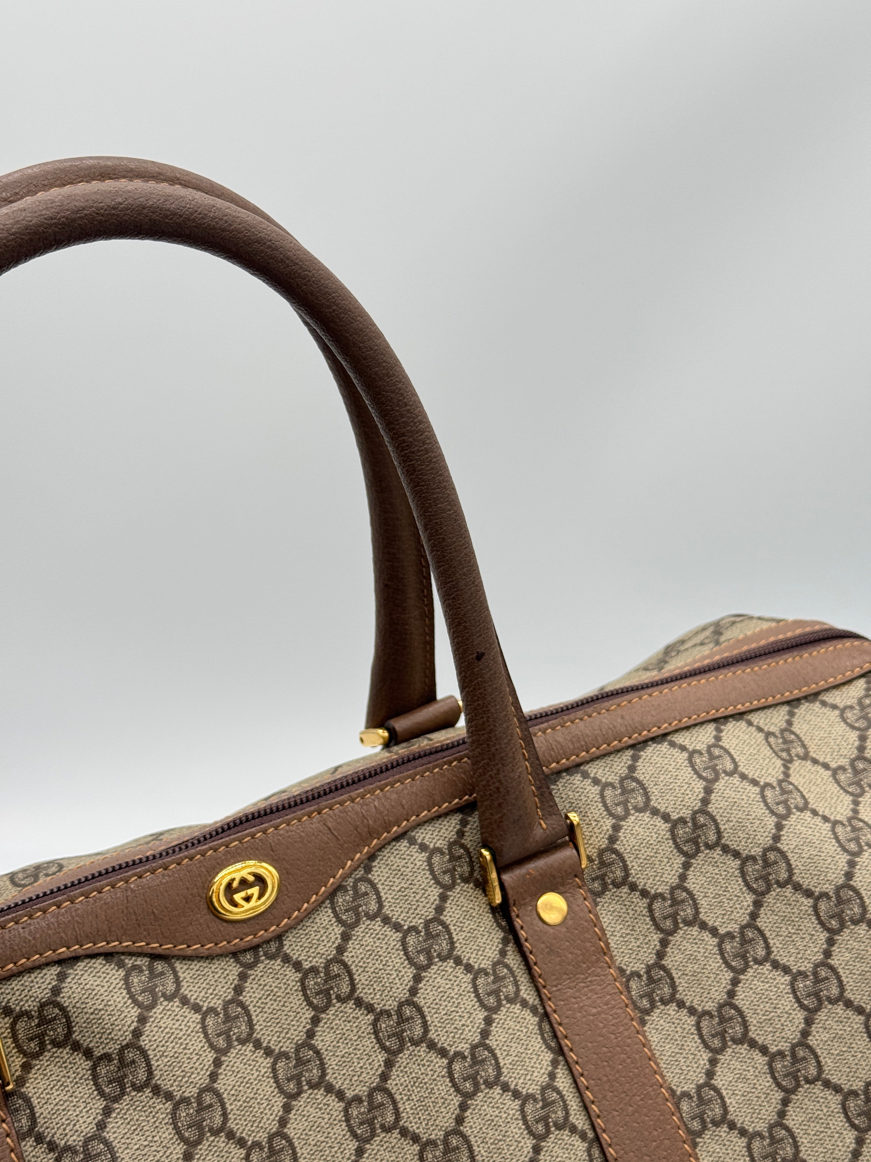 This pre-loved Gucci Boston 45 has beige monogram canvas with brown details and gold hardware. The serial number is 012 1732 6081 06. The item is in a very good vintage condition, with general signs of wear. The measurements are 44 x 27 x 23 cm. The handle drop is 15 cm. The inside is a bit powdery, using an insert is recommended.