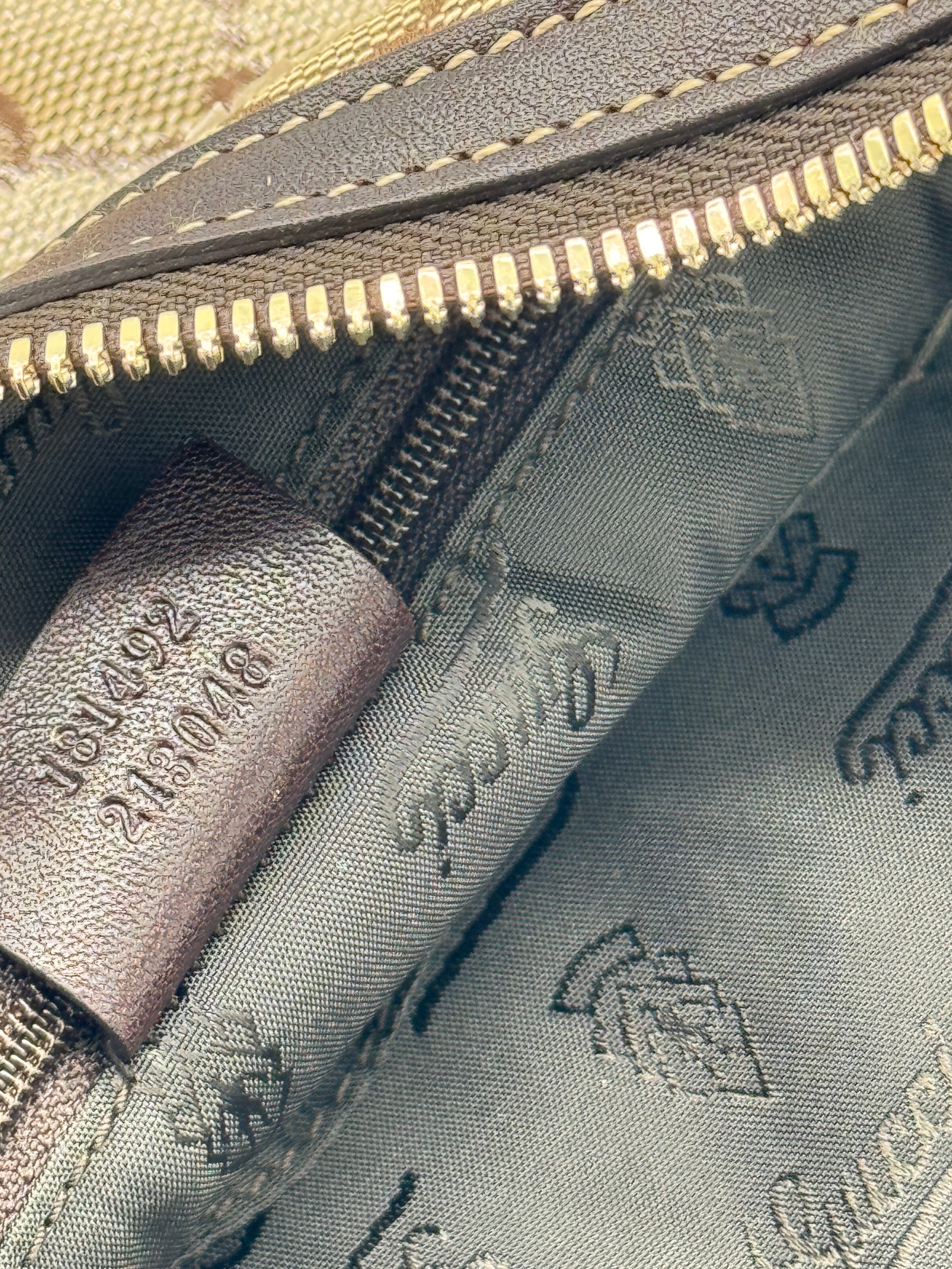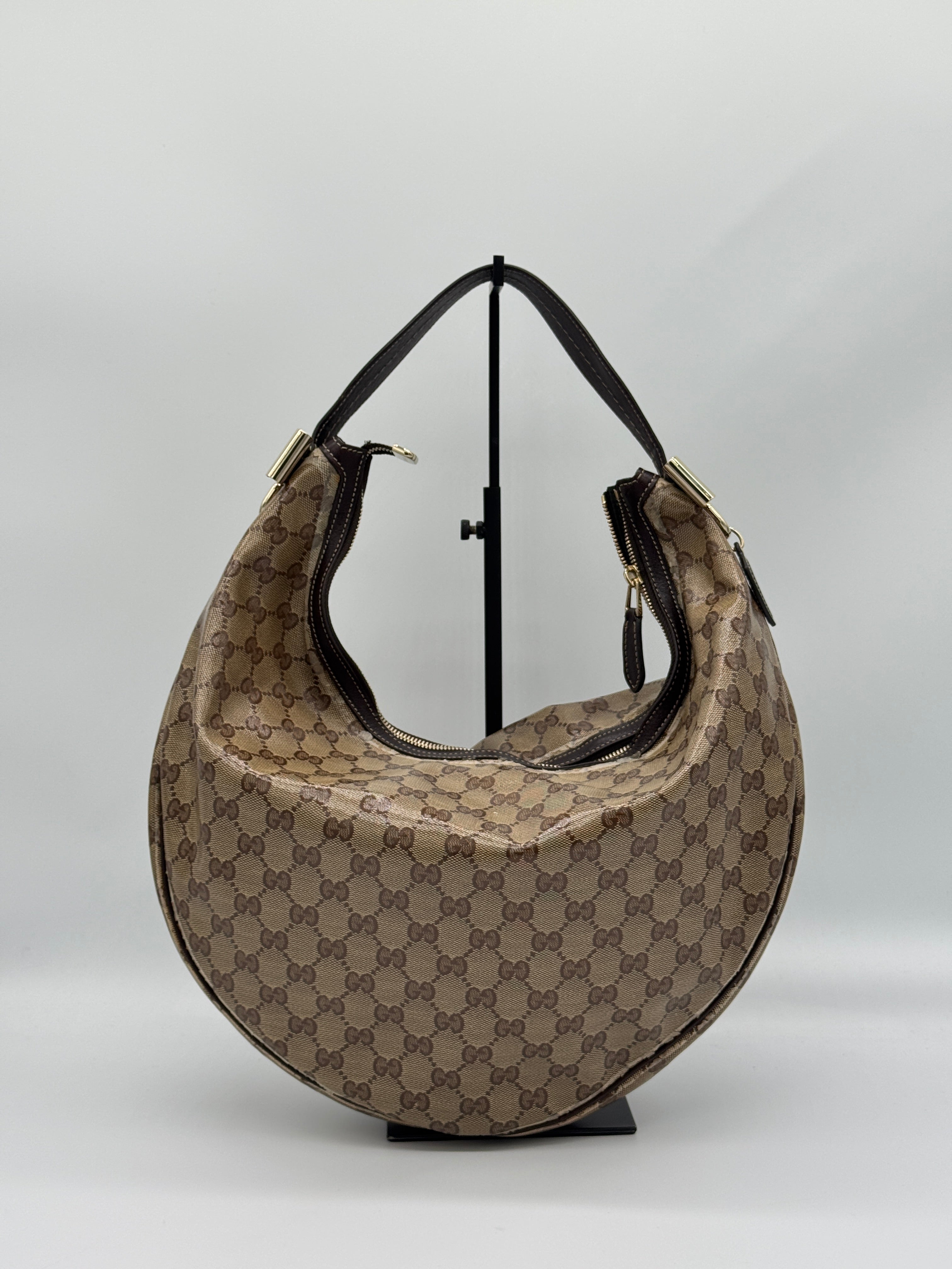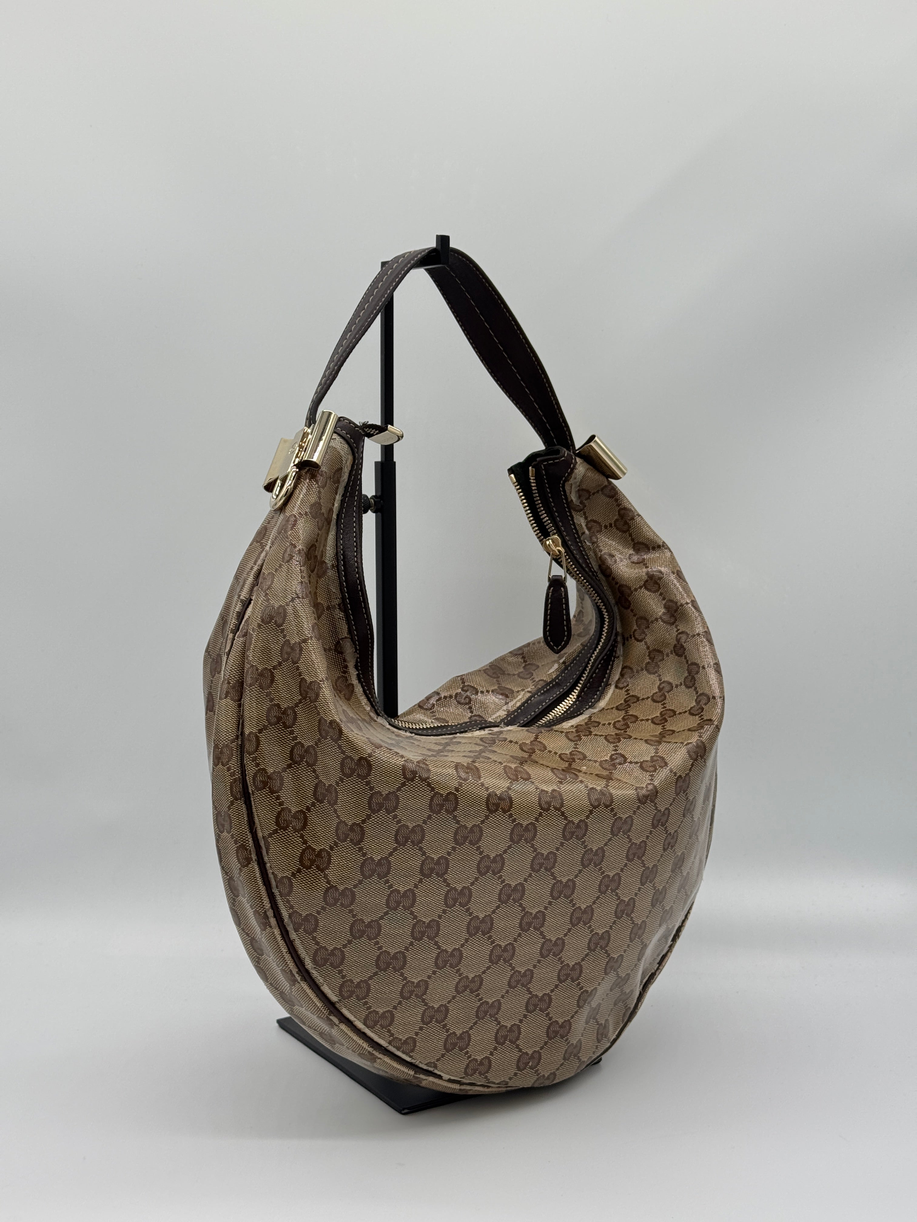 This pre-loved Gucci Crystal Coated Hobo has beige canvas with dark brown details and gold hardware. The bag has general signs of wear and therefore it's in a very good good condition. The serial number is 191492 213049. The measurements are 33 x 28 x 4 cm.