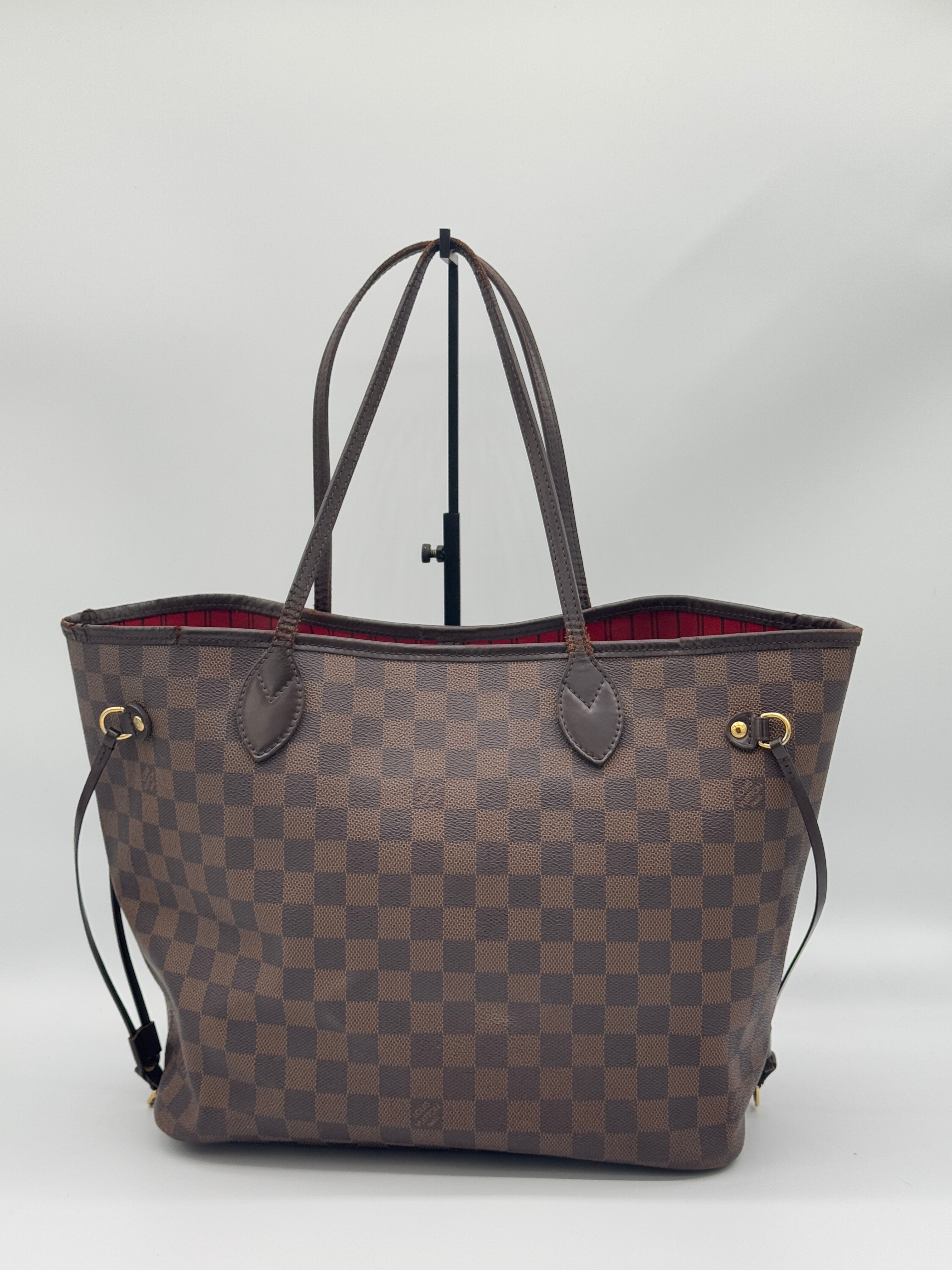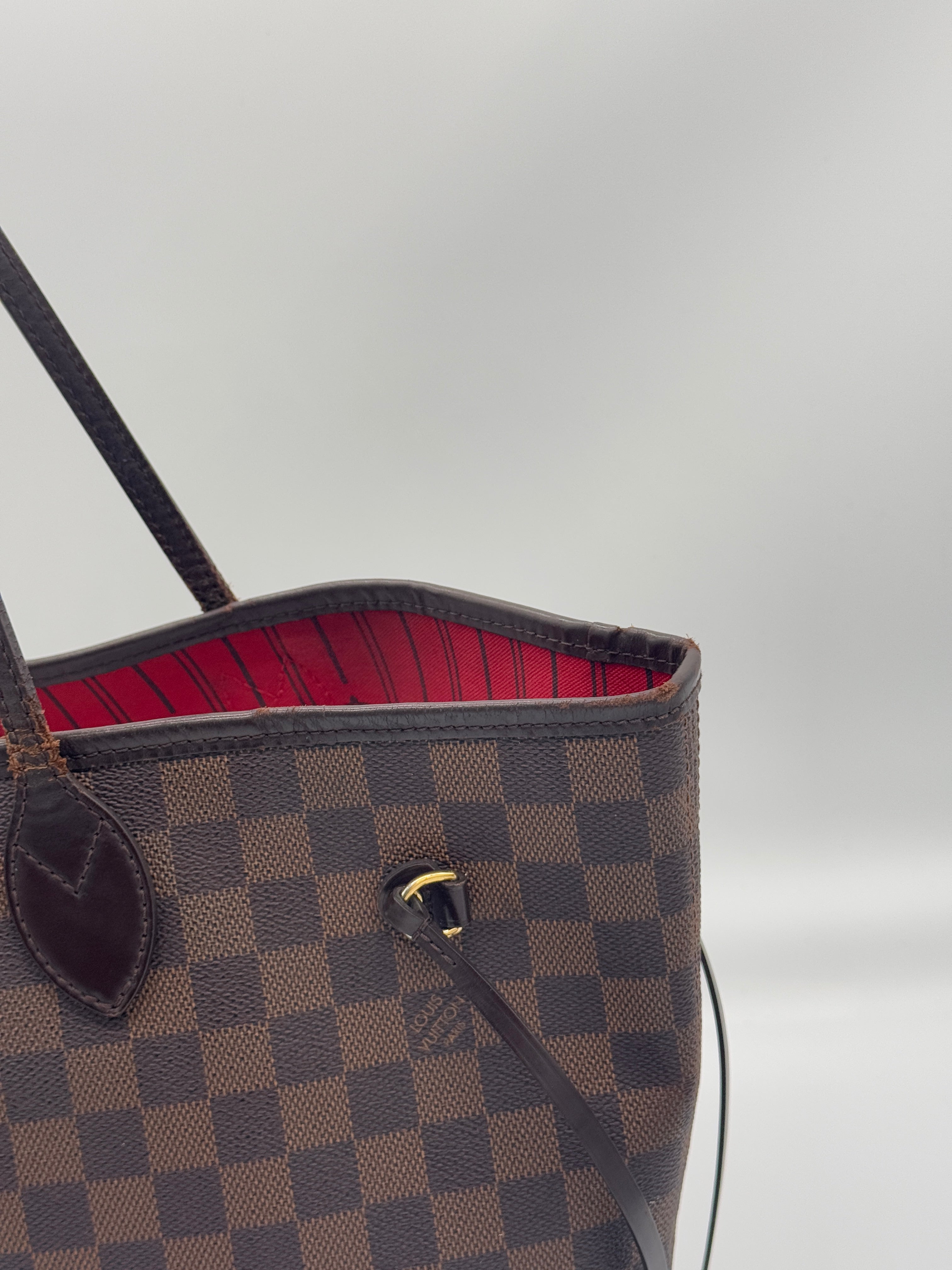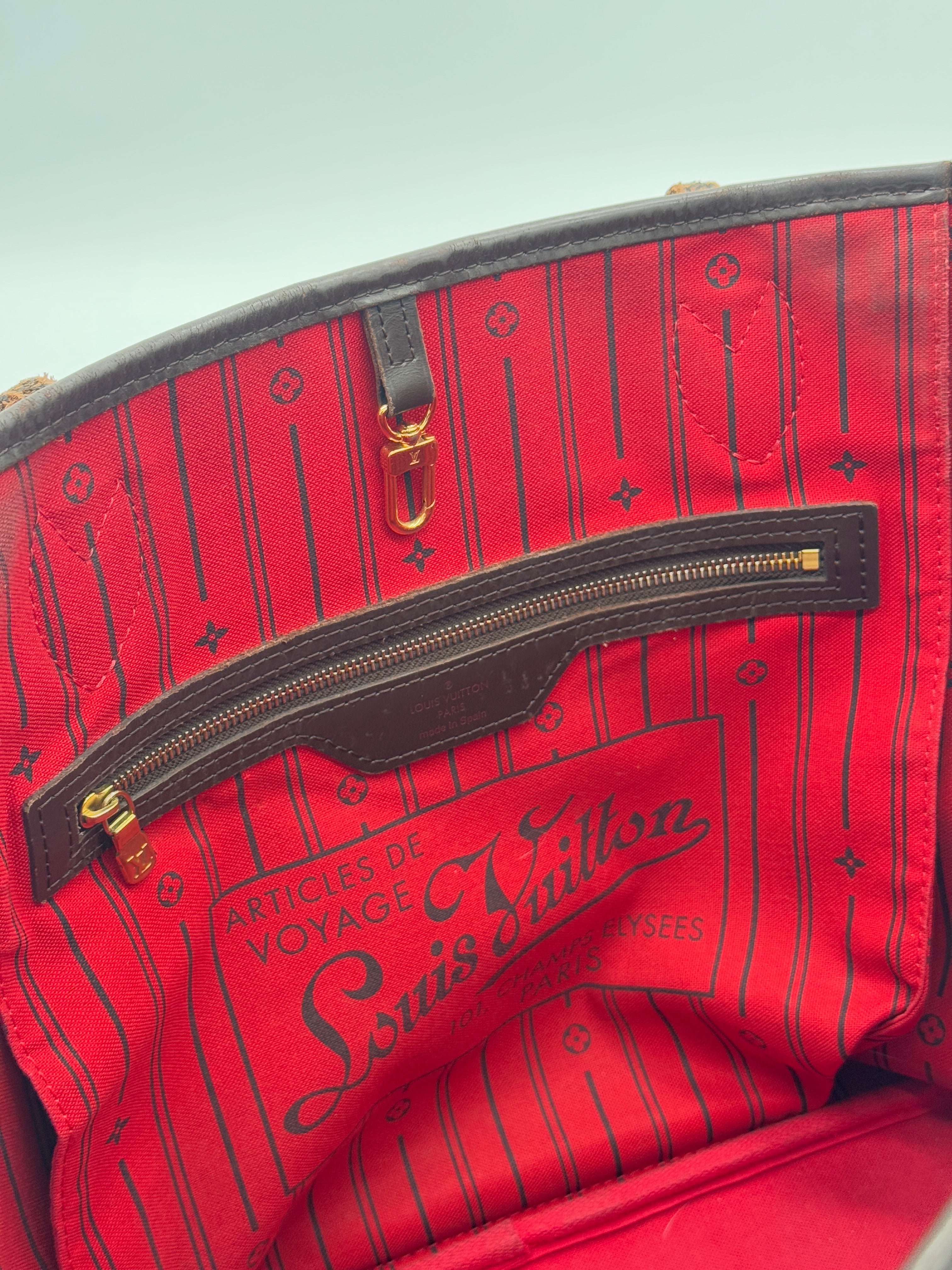 This pre-loved Louis Vuitton Neverfull MM in damier ebene has gold hardware. The inside is made of red cotton. The bag has general signs of wear on the leather and therefore it's in a very good vintage condition. The date code is CA2130 (Made in Spain in 2010). The measurements are 31 x 28 x 14 cm.